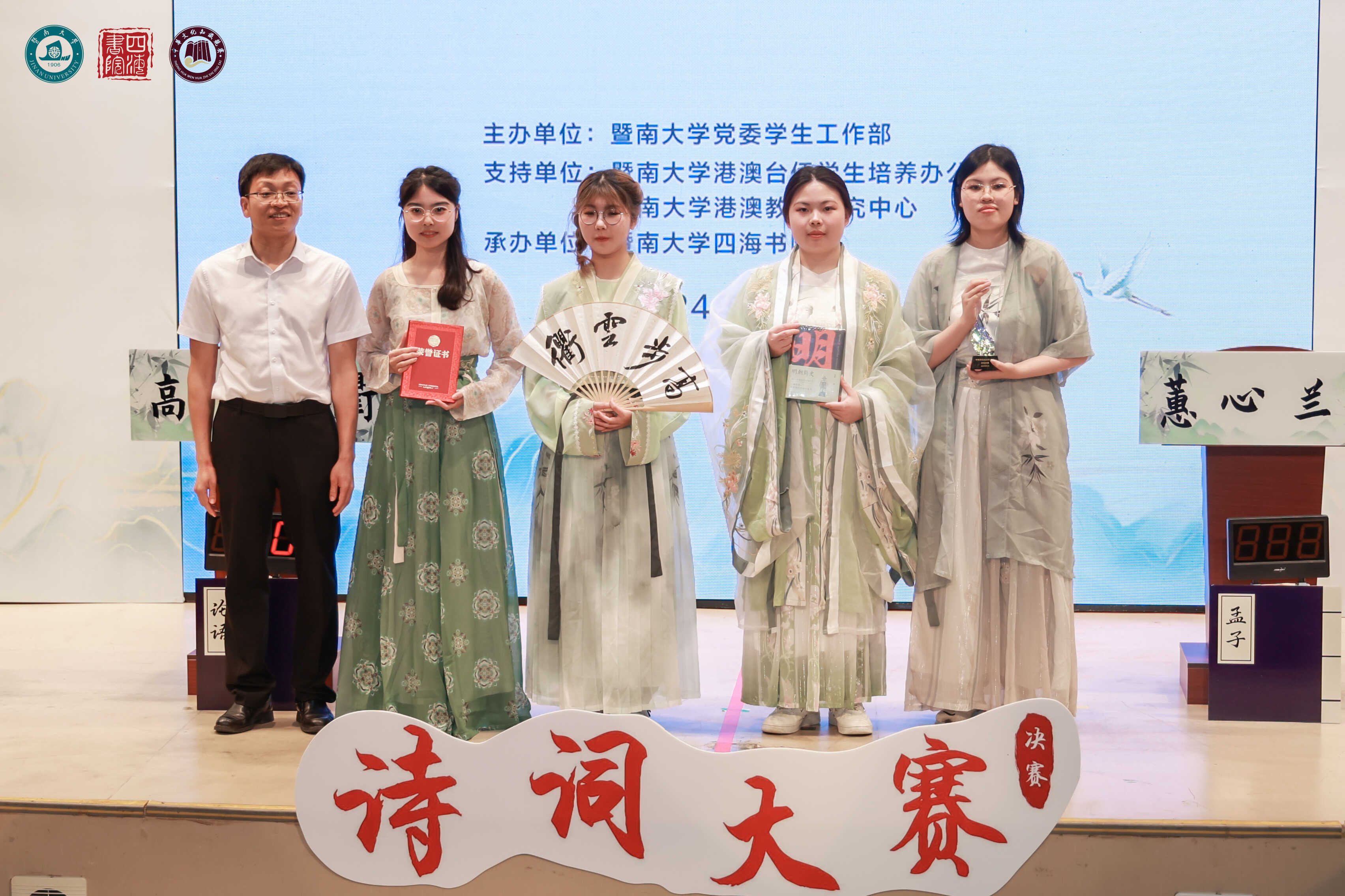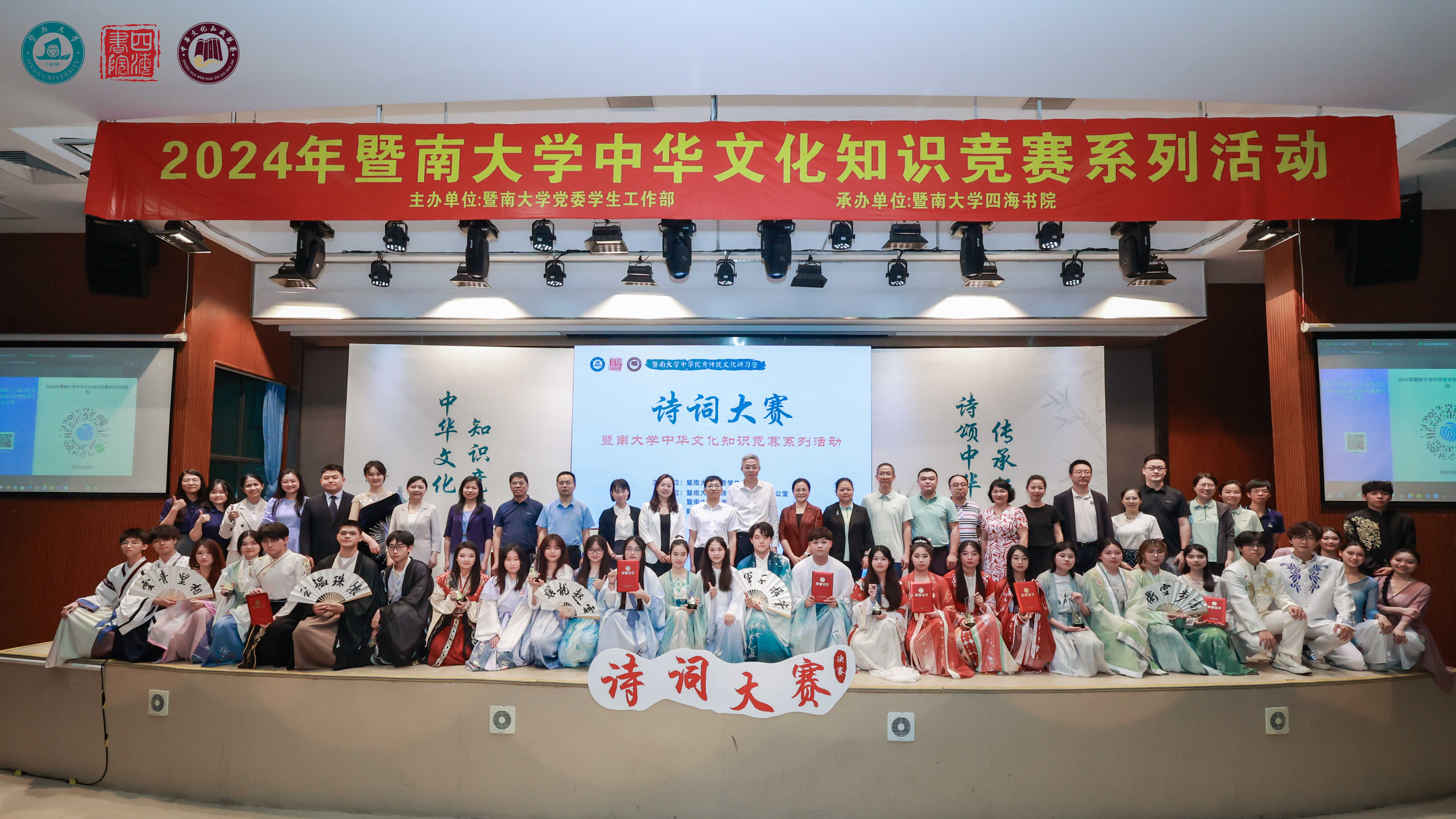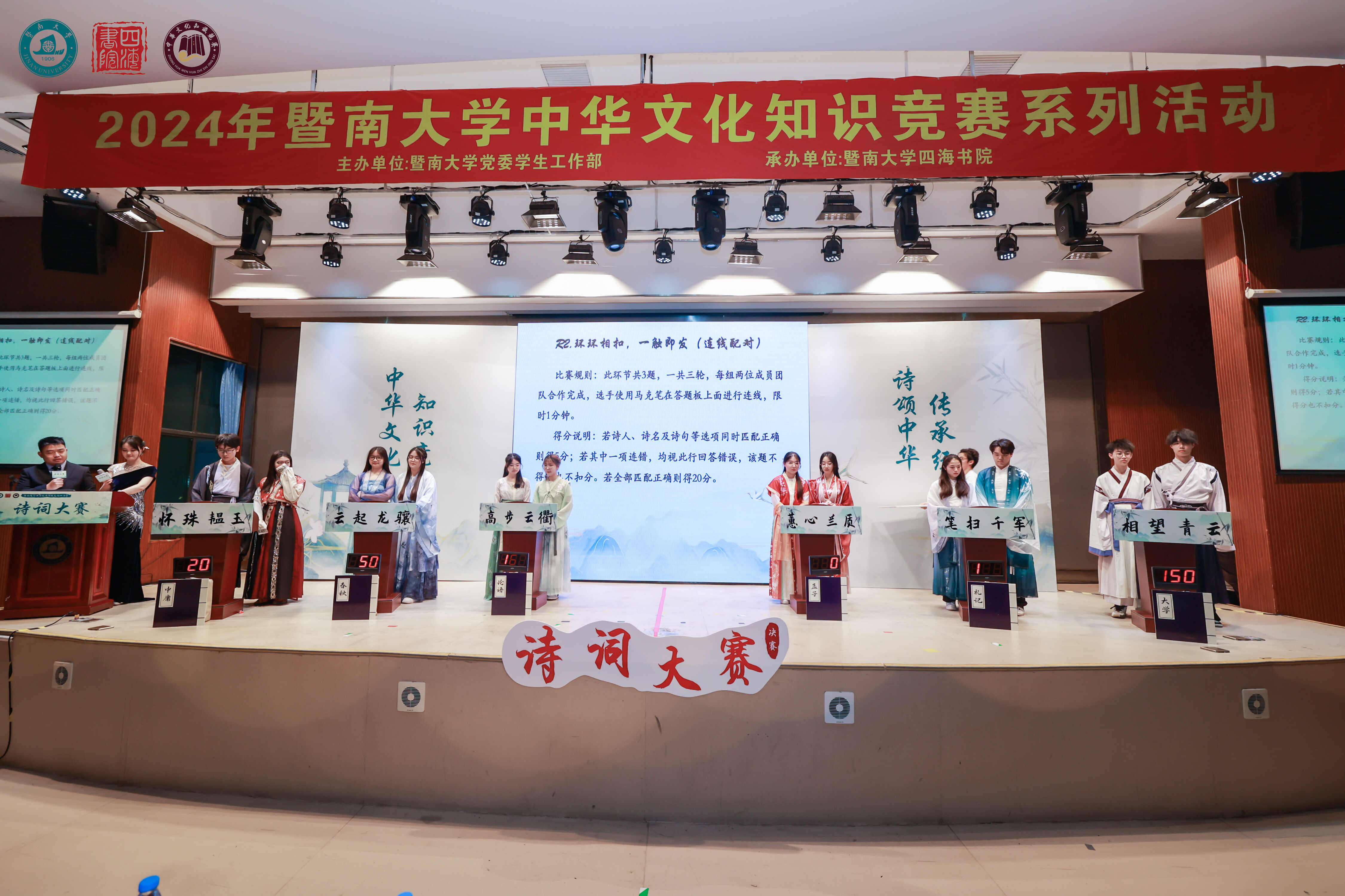 5月9日,暨南大学开展了2024年“诗颂中华·传承经典”中华文化知识竞赛系列活动之诗词大赛总决赛。24名身着汉服的选手登上舞台,开启攀登“诗词王座”的角逐之旅。