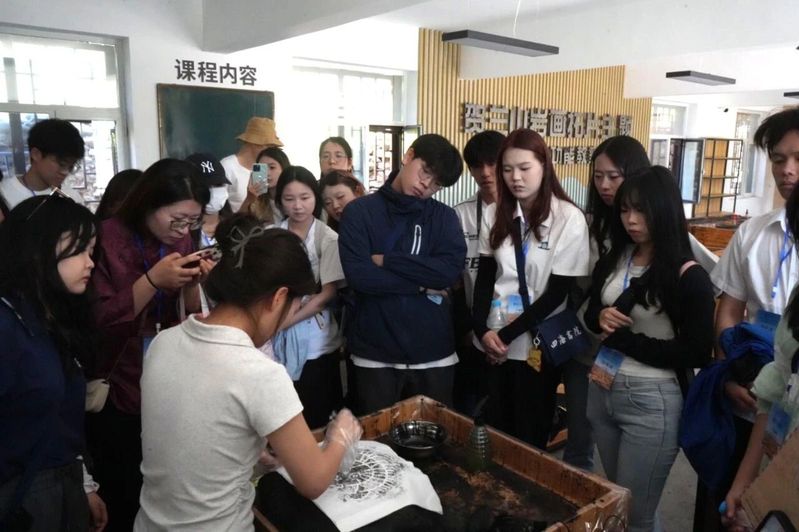 8月31日,研习营先后前往贺兰山岩画遗址公园与拜寺口双塔。贺兰山岩画生动呈现了狩猎放牧、祭祀舞蹈、天体神灵等生活场景,这是中华先民原始文化艺术的重要遗存。学子还亲手拓印岩画,沉浸其中感受古老文明的魅力,来自中国香港的何美妍兴奋直言:“这是我第一次亲手制作岩画拓片,感觉直接触摸到了远古文明,太珍贵了!”